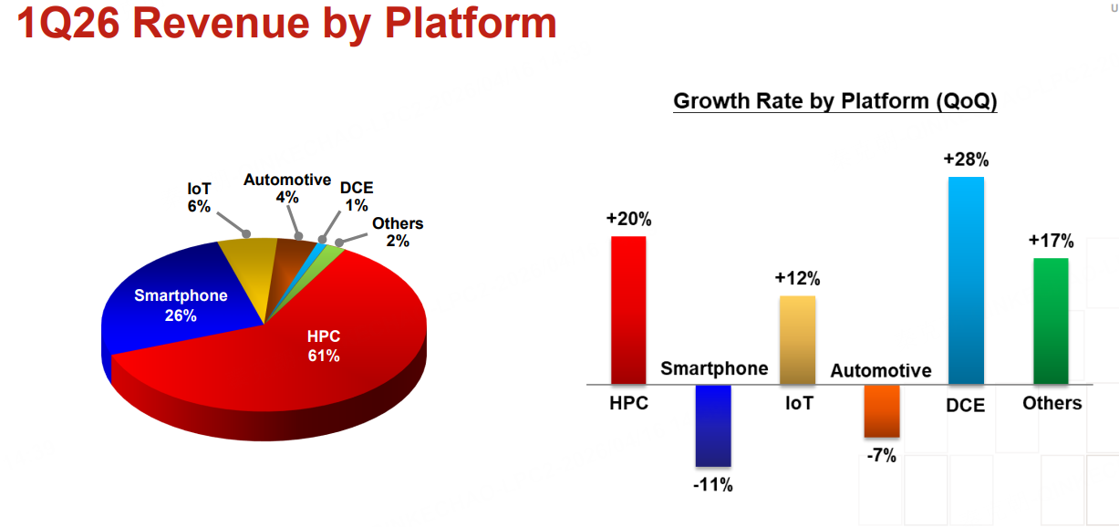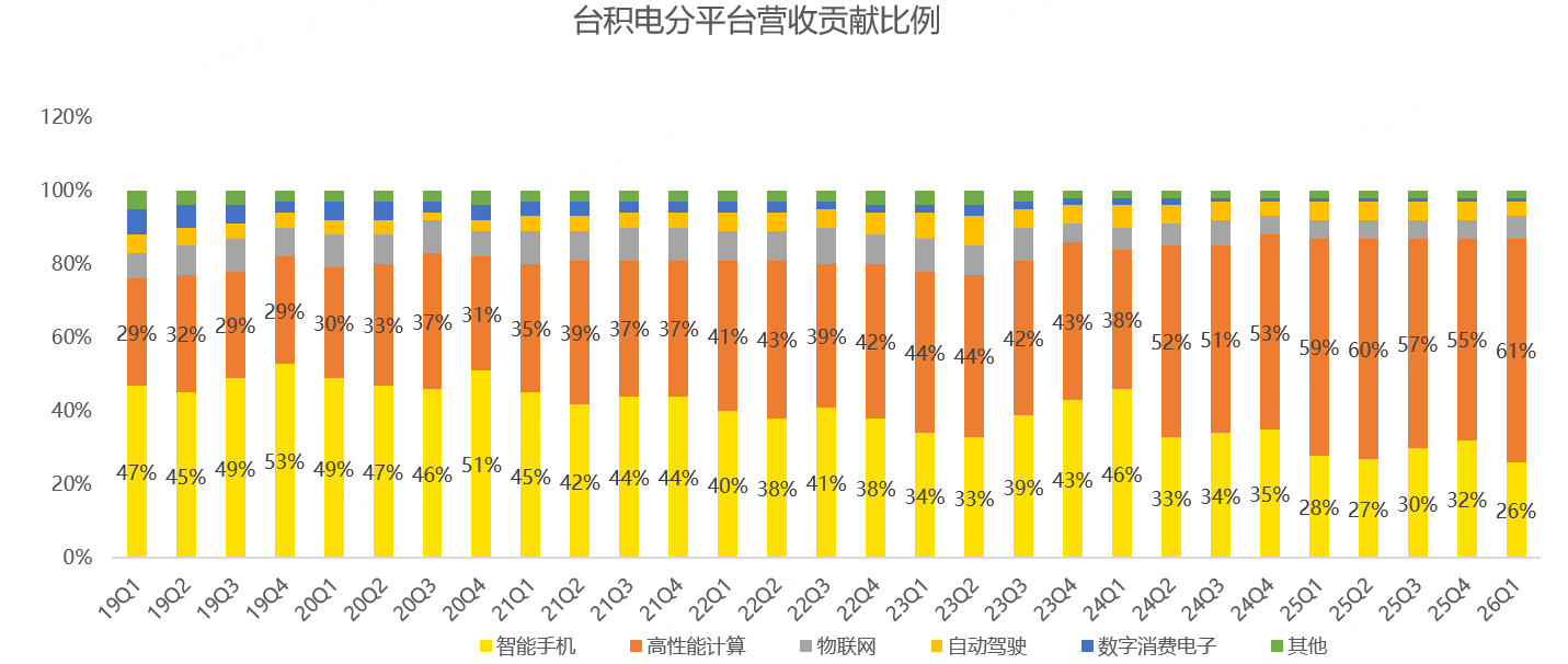 2022年以前,HPC贡献的收入仅占30%,智能手机占比近一半,寥寥几年,HPC崛起成最大的收入来源:
