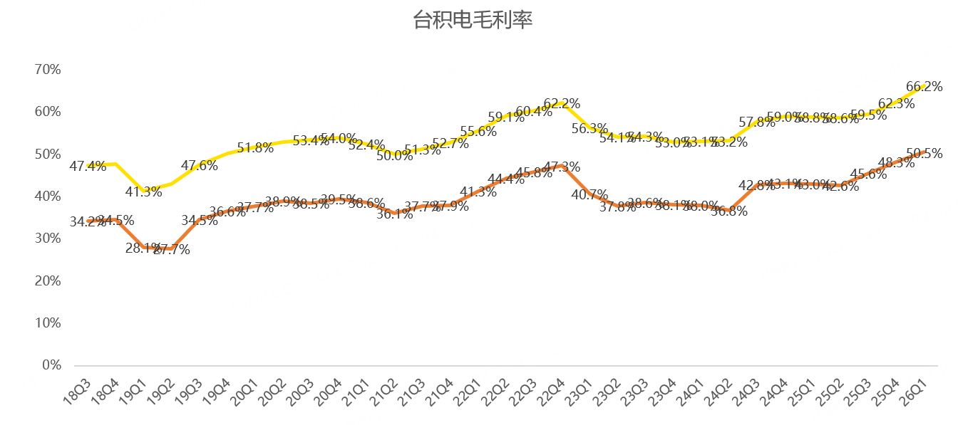 从一季度来看,台积电毛利率达到66.2%,大幅超过管理层给出的63%-65%的指引,创历史记录!净利率更是达到惊人的50.5%,暴利程度不像是制造业: