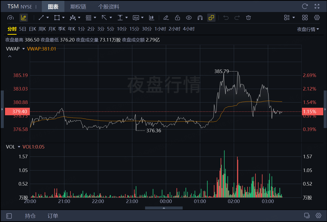 从老虎证券夜盘来看,台积电股价在财报披露后有明显拉升,但涨幅很快回落: