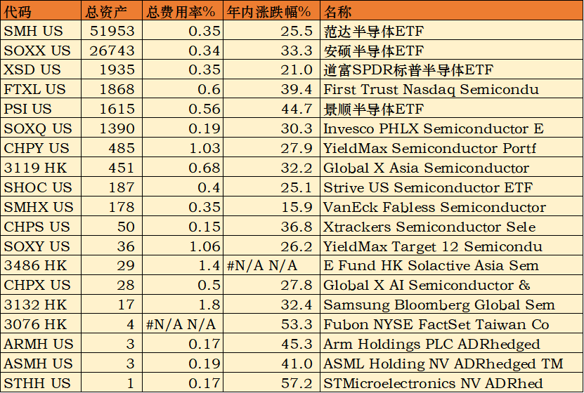 规模最大的是 $半导体指数ETF-HOLDRs(SMH)$ ,520亿美元,流动性好,管理费率0.35%,适中,年内涨幅25.5%;其重仓英伟达和台积电,两支票占净值的比重超30%;