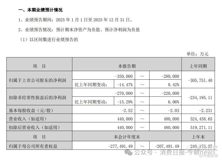 公告显示,公司预计2025年归母净利润亏损28亿至35亿元,这将是公司连续第六年亏损。更为关键的是,预计2025年末归母净资产将为-20.75亿至-27.75亿元,正式陷入资不抵债的境地。
