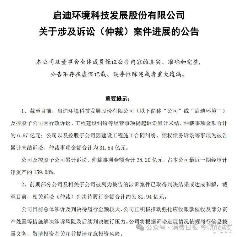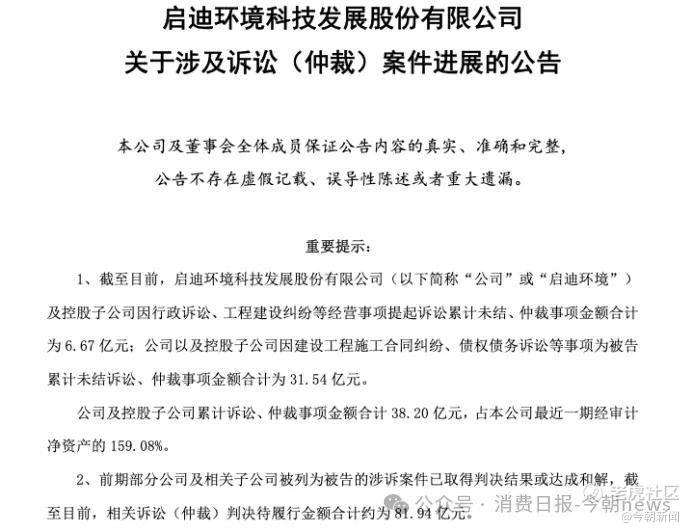 另外,启迪环境隐形债务问题持续发酵。截至2026年4月10日,公司累计未结涉诉金额38.20亿元,占最近一期经审计净资产的159.08%。