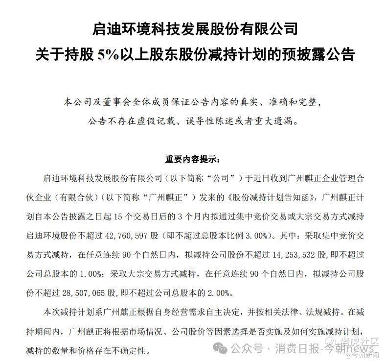 4月14日晚间,启迪环境发布股东减持公告。公司持股5%以上股东广州麒正计划在未来三个月内减持不超过4276万股,占公司总股本的3%。广州麒正2025年7月通过司法拍卖获得启迪环境5.81%的股份,8月完成过户,持股仅8个月便计划减持。