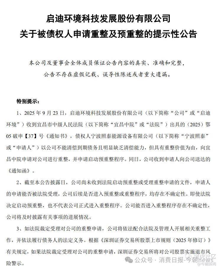 2025年9月23日,债权人宁波照泰能源设备有限公司以公司不能清偿到期债务且明显缺乏清偿能力为由,向宜昌市中级人民法院提出重整申请,公司随即启动预重整程序,这也成为其挽救上市地位的最后一根稻草。