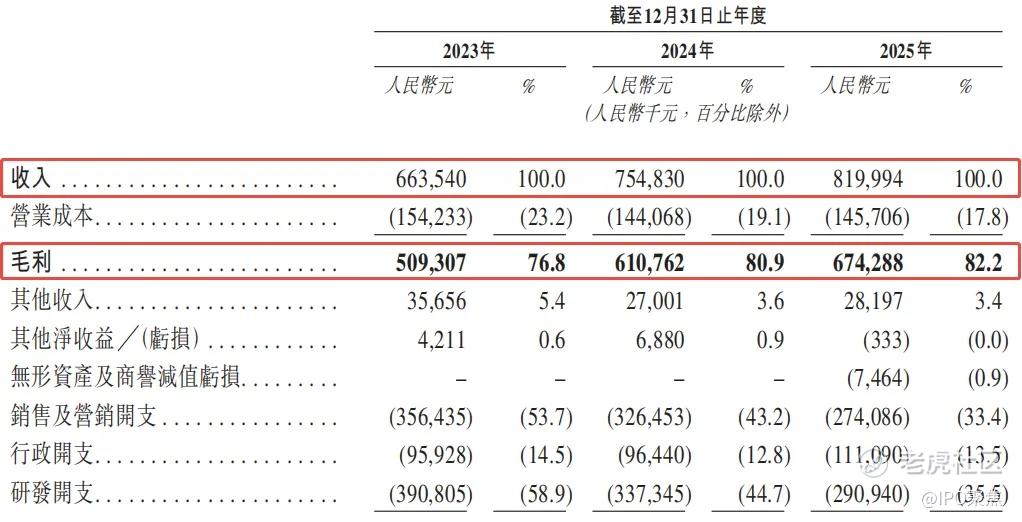 公司的毛利亦是如此,从2023年至2025年,分别为5.1亿元、6.1亿元及6.7亿元,复合年增长率为15.1%,对应的毛利率为76.8%、80.9%及82.2%。