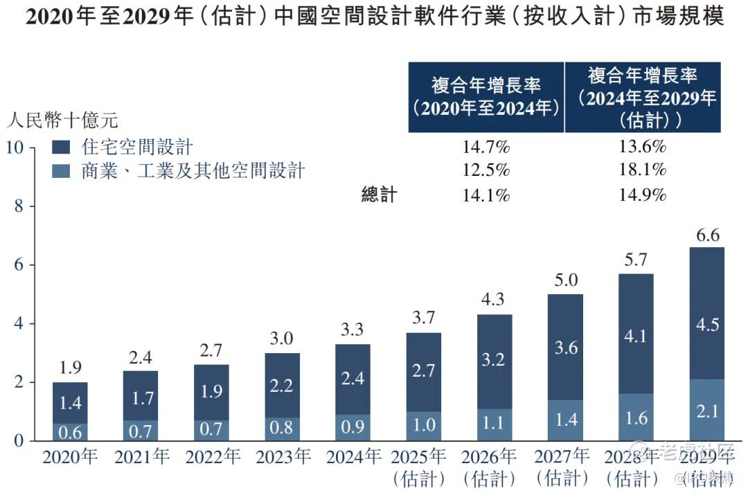 随着AI技术大幅赋能空间设计软件行业,使创新、效率及优化达至前所未有的水平。据弗若斯特沙利文资料,中国空间设计软件行业的市场规模(按收入计)于近5年快速增长,从2020年的19亿元增至2024年的33亿元,复合年增长率为14.1%,后续预计将以14.9%的速度增至2029年的66亿元。