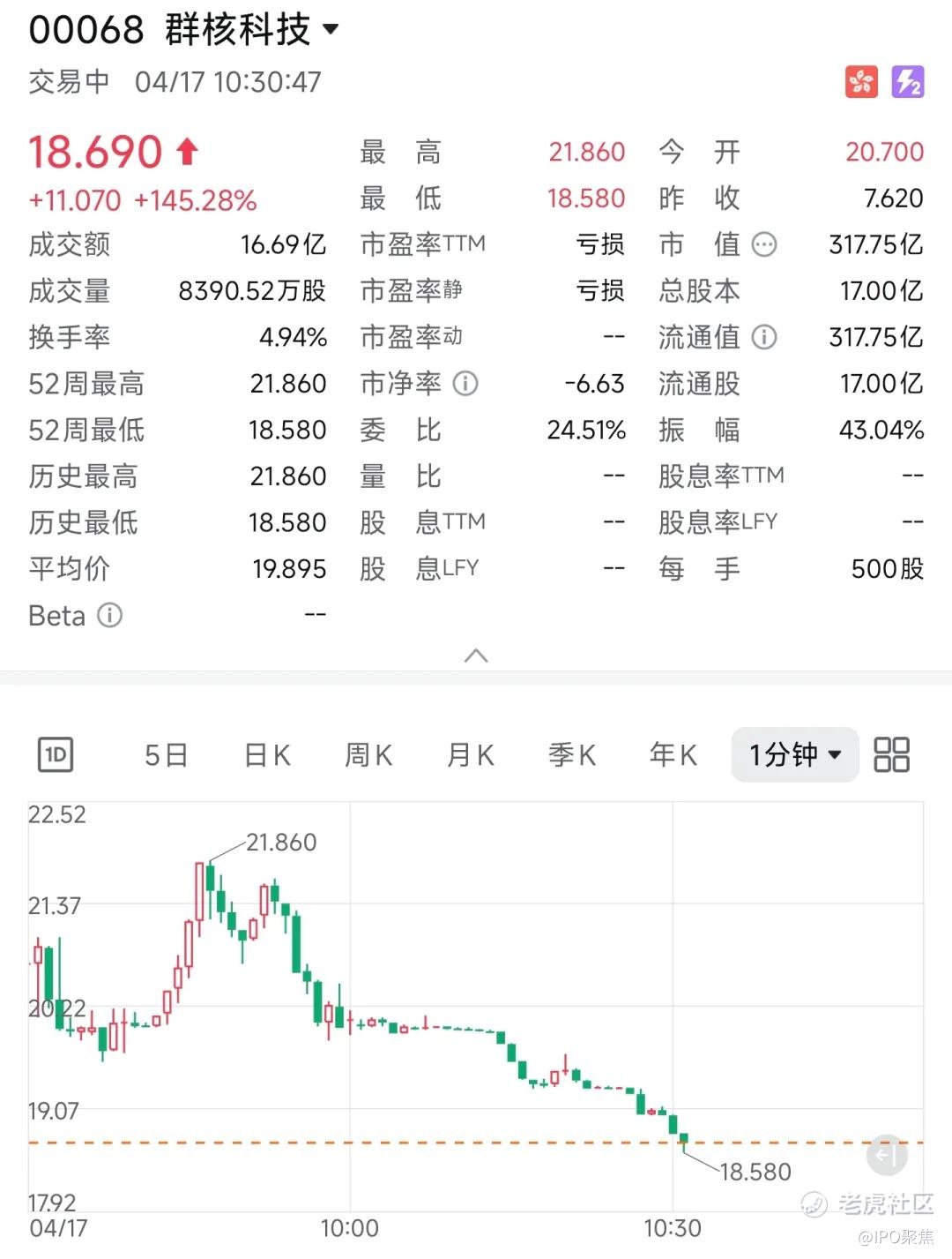 今日开盘半小时最高涨幅达到186.88%,报21.86港元。截至发文前,涨145.28%,报18.69港元,总市值317.75港元。
