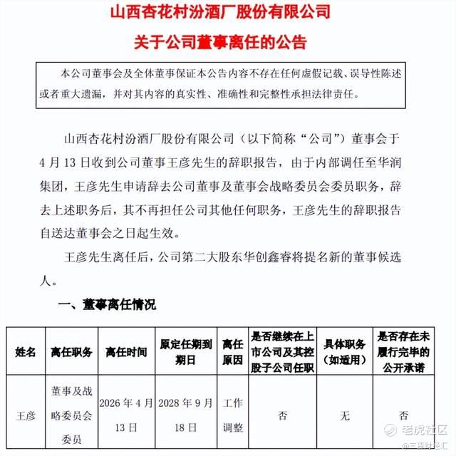 而此次王彦离任,也再度引发市场对“华润系”参与山西汾酒治理的关注。公司表示,空缺董事职位将由华创鑫睿提名新候选人,届时三晋财经汇将继续关注。 $山西汾酒(600809)$