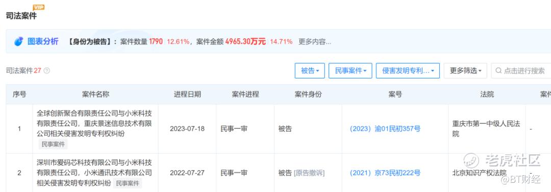 据天眼查数据,小米法律诉讼999+,以被告身份出现的案件1790件,其中涉及侵害发明专利的诉讼27起——还不含本次美的四起。