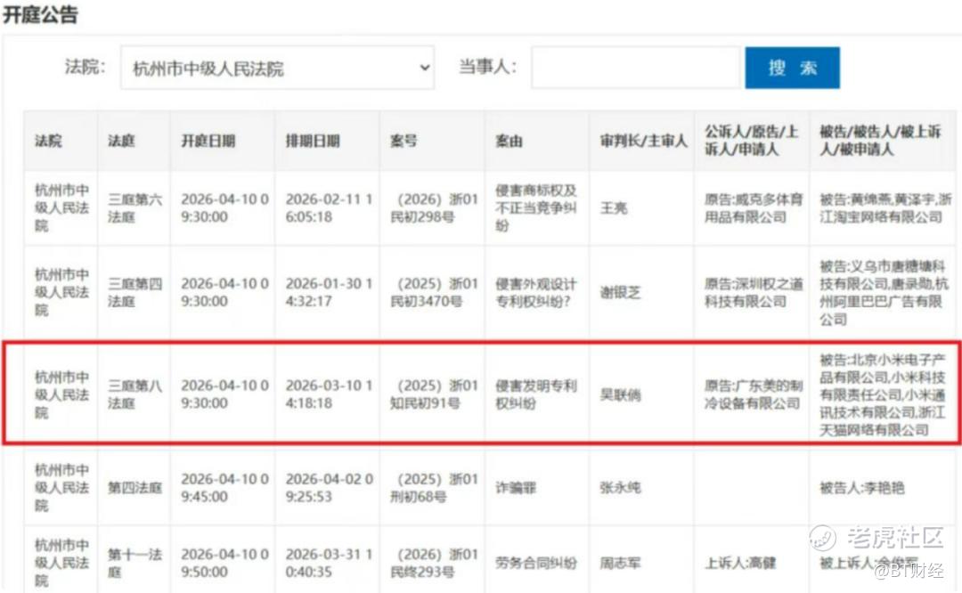 2026年4月10日,杭州市中级人民法院一则开庭公告显示,美的对小米的第四起发明专利侵权诉讼正式开庭。案号(2025)浙01知民初91号。