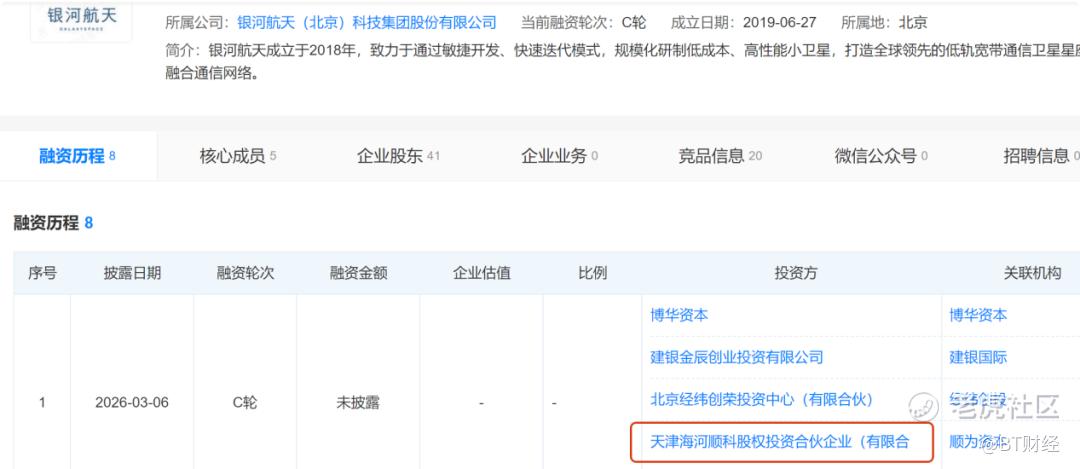 据天眼查,3月26日银河航天股权变动显示,顺为资本旗下天津海河顺科股权投资合伙企业新增为前十大股东,雷军持该主体39.1%股份,为受益所有人。银河航天由创始人徐鸣于2018年在雷军支持下创立,顺为资本从天使轮一路跟投至今。