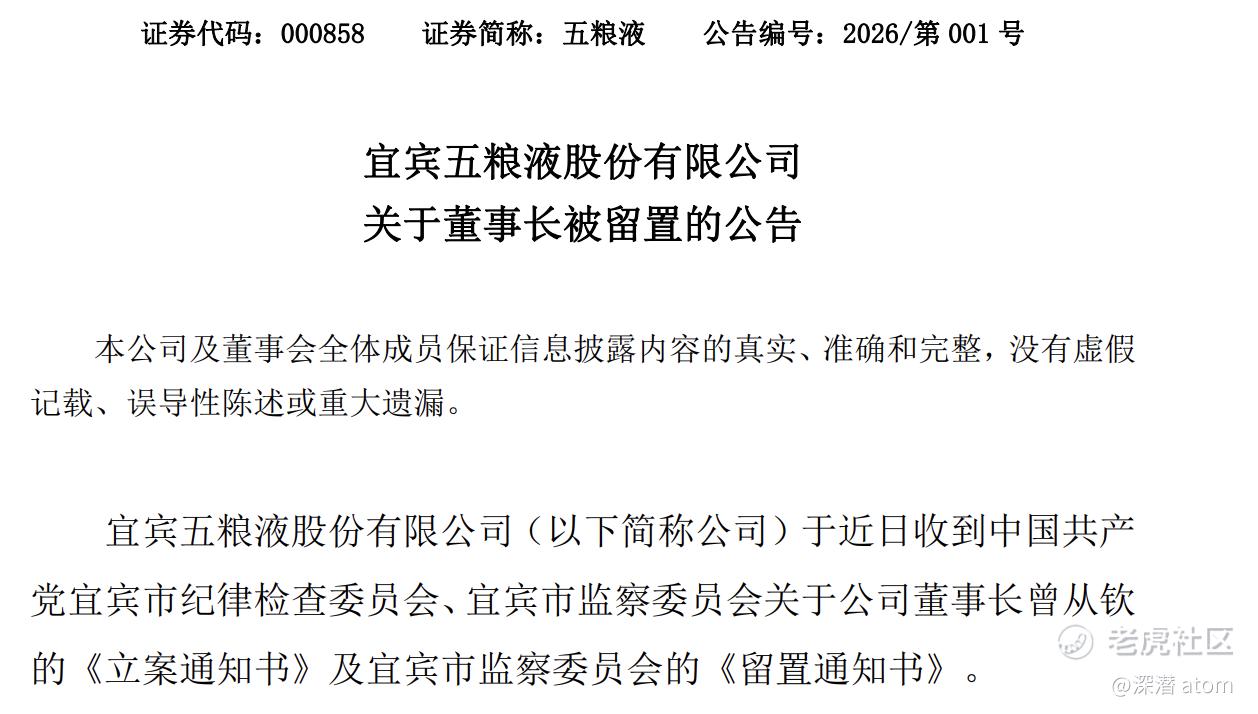 比业绩滑坡更致命的,是2026年2月28日爆发的人事大地震,五粮液发布公告,确认收到宜宾市纪委监委关于董事长曾从钦的《立案通知书》及《留置通知书》。曾从钦因涉嫌严重违纪违法,目前正接受宜宾市纪委监委纪律审查和监察调查。