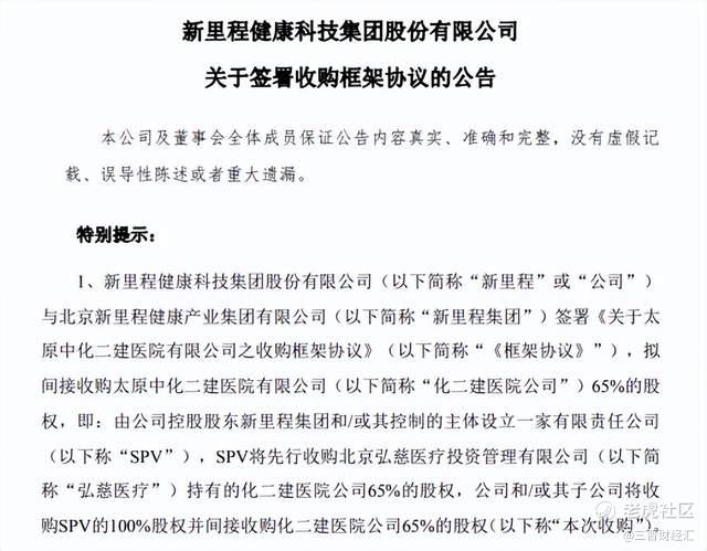 4月15日,A股上市公司新里程(002219.SZ)发布公告称,公司与控股股东北京新里程健康产业集团有限公司(以下简称“新里程健康集团”)签署《关于太原中化二建医院有限公司之收购框架协议》。