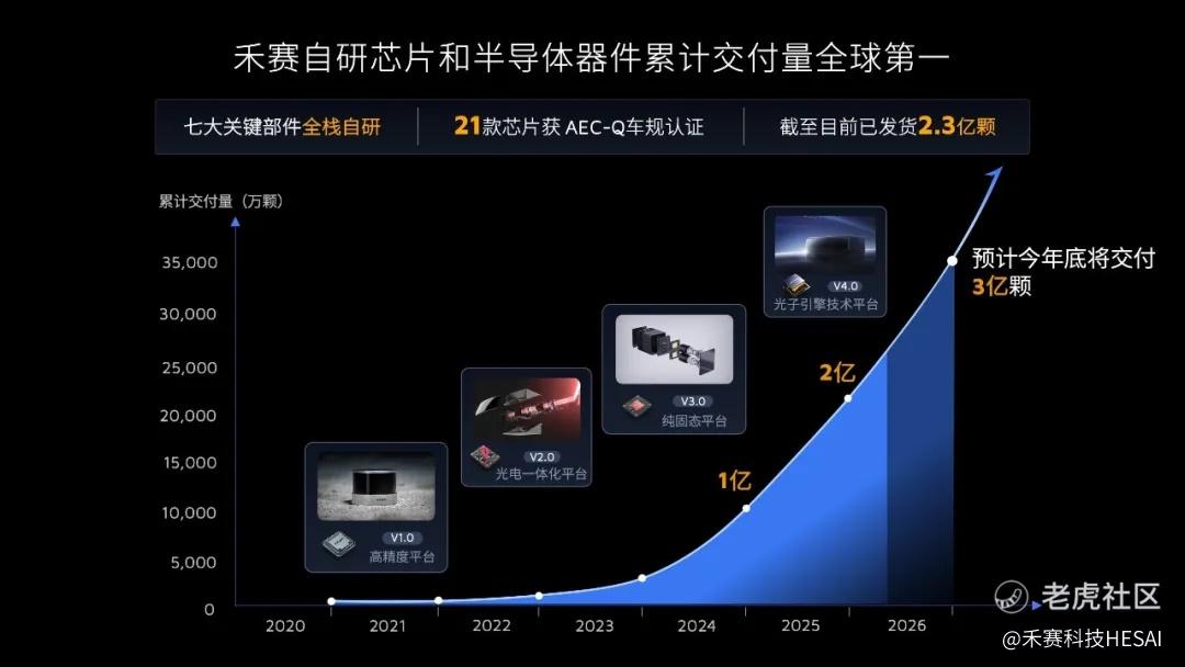 跨越五代芯片平台研发与量产,禾赛目前是唯一行业做到包括激光器、探测器、激光驱动器、TIA 芯片、ADC 芯片、数字信号处理器和控制器七大关键部件全栈自研的激光雷达公司。截止目前,禾赛已有 21 款自研芯片获得 AEC-Q 车规认证,已累计交付达 2.3 亿颗,预计到 2026 年底,累计出货量将超 3 亿颗,自研芯片和半导体器件累计交付量居行业内全球第一 。