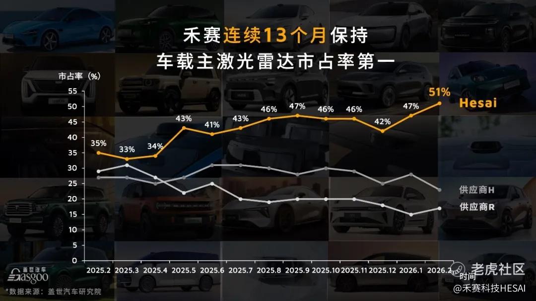 禾赛科技持续领跑中国车载激光雷达市场。据盖世汽车研究院数据,2025 年禾赛以超 40%市场份额位居行业第一,2026 年延续高速增长态势,2 月份额进一步提升至 51%,装机量达行业第二名的 2.2 倍、第三名 3 倍以上,连续 13 个月保持市场领先地位。公司产品深度配套理想、小米、比亚迪、极氪等头部车企热销车型,其中小米 YU7 及新款 SU7 全系搭载禾赛激光雷达。截至目前,禾赛已获得 40 家汽车品牌超 160 款车型量产定点,覆盖中国销量前十的全部汽车品牌。