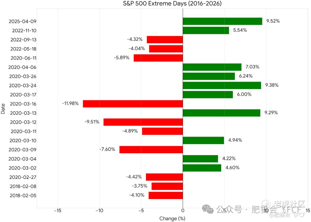 根据我们对标普500 $标普500ETF(SPY)$ 过去十年(2016-2026)的极端波动日复盘,2020年3月的新冠熔断潮和2025年上半年的动荡期,贡献了绝大多数的“Top 10 暴涨日”。