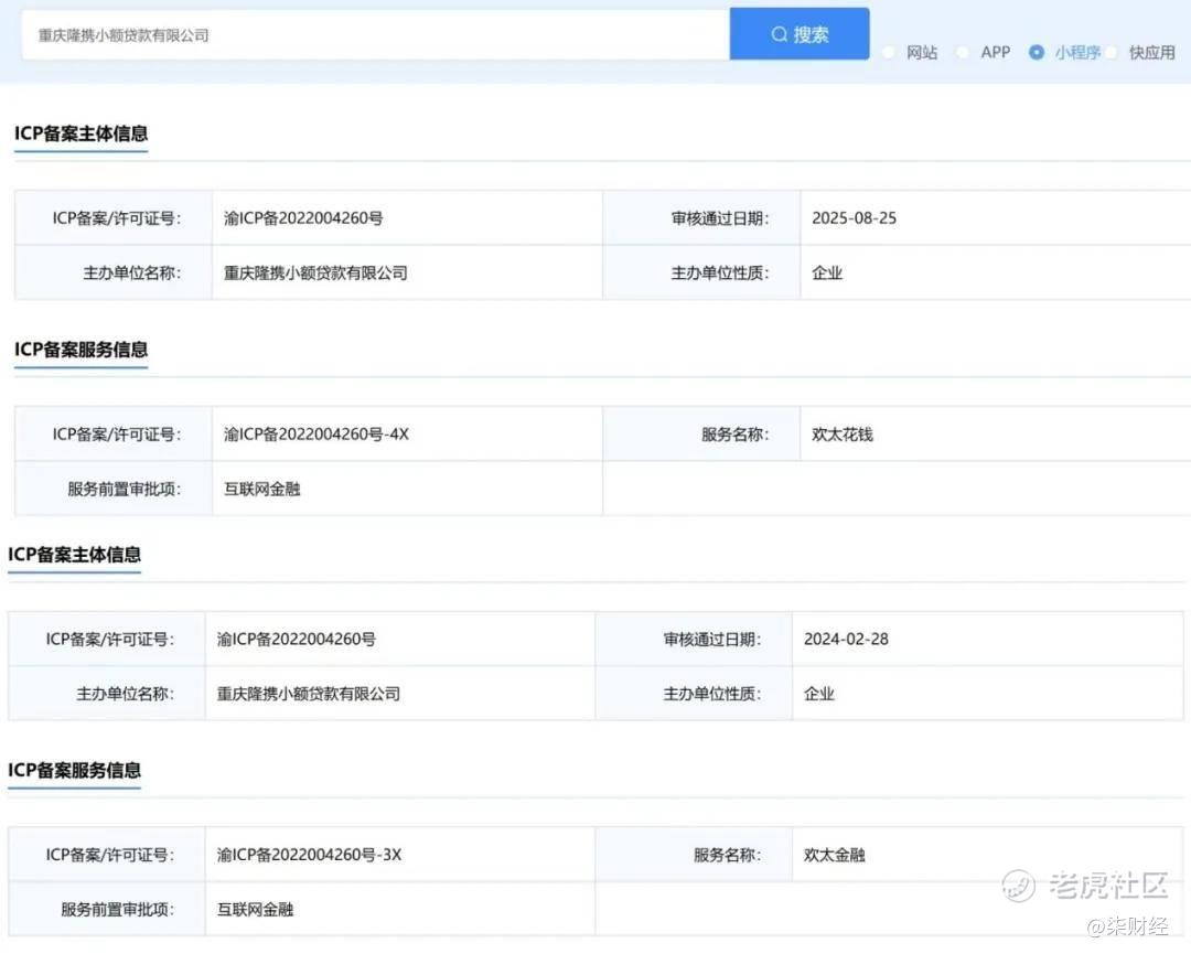 天眼查显示,OPPO、VIVO联合持股的重庆隆携小额贷款有限公司(简称“隆携小贷”),注册资本50亿元,于2024年和2025年分别备案了“欢太金融”“欢太花钱”两款互金小程序。