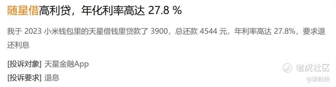 “在小米钱包里的天星借钱里贷款了3900,总还款4544元,年利率高达27.8%”