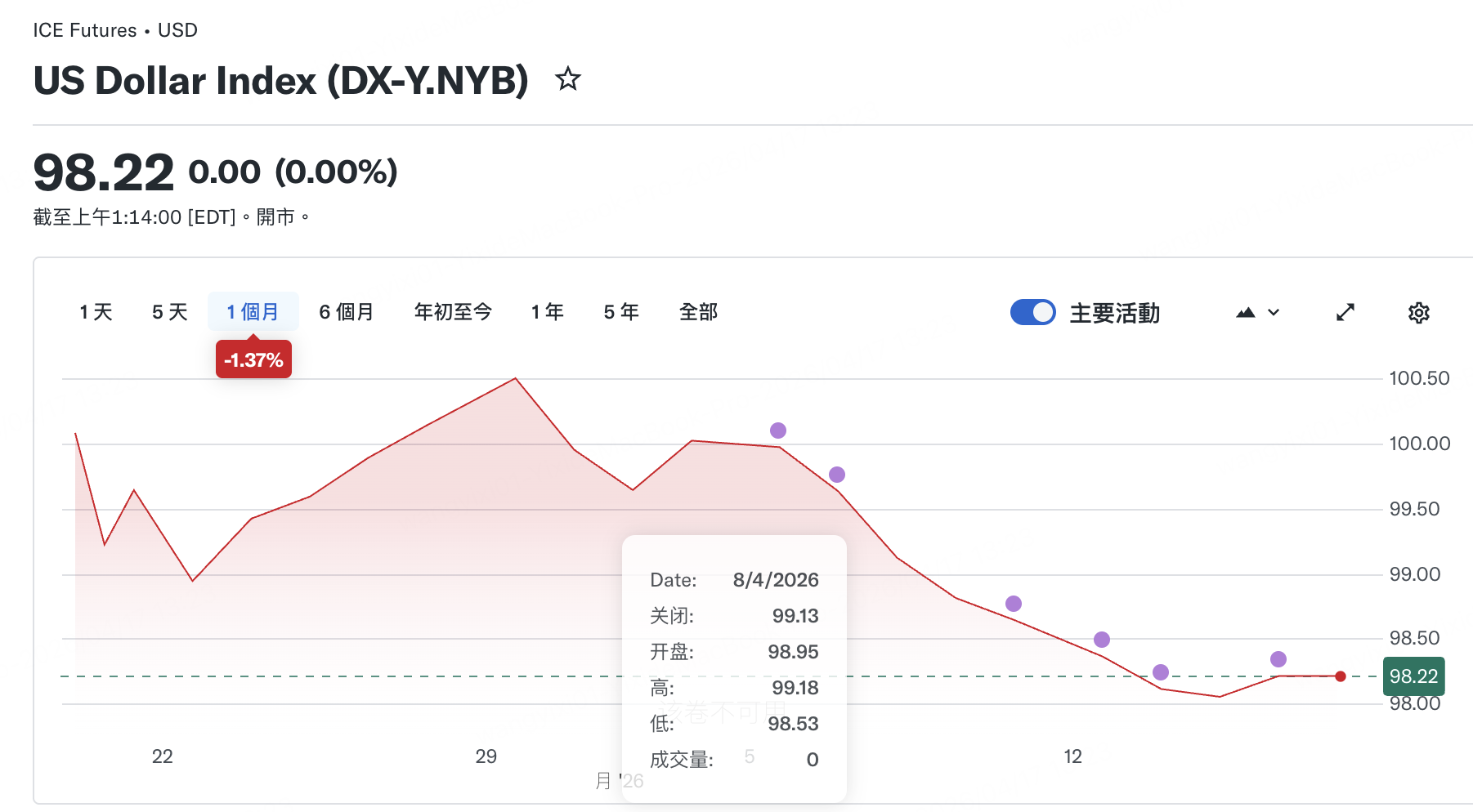 最新汇市动态(截至4月17日亚市)显示,美元指数回落至98.13附近,较冲突高峰回落逾1.4%。 这波回吐「加速」而非缓慢,显示机构仓位调整极为果断。