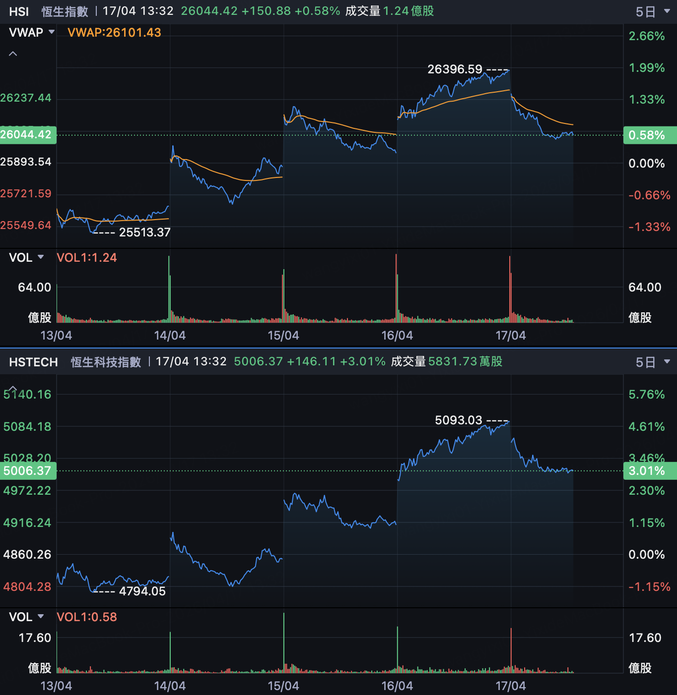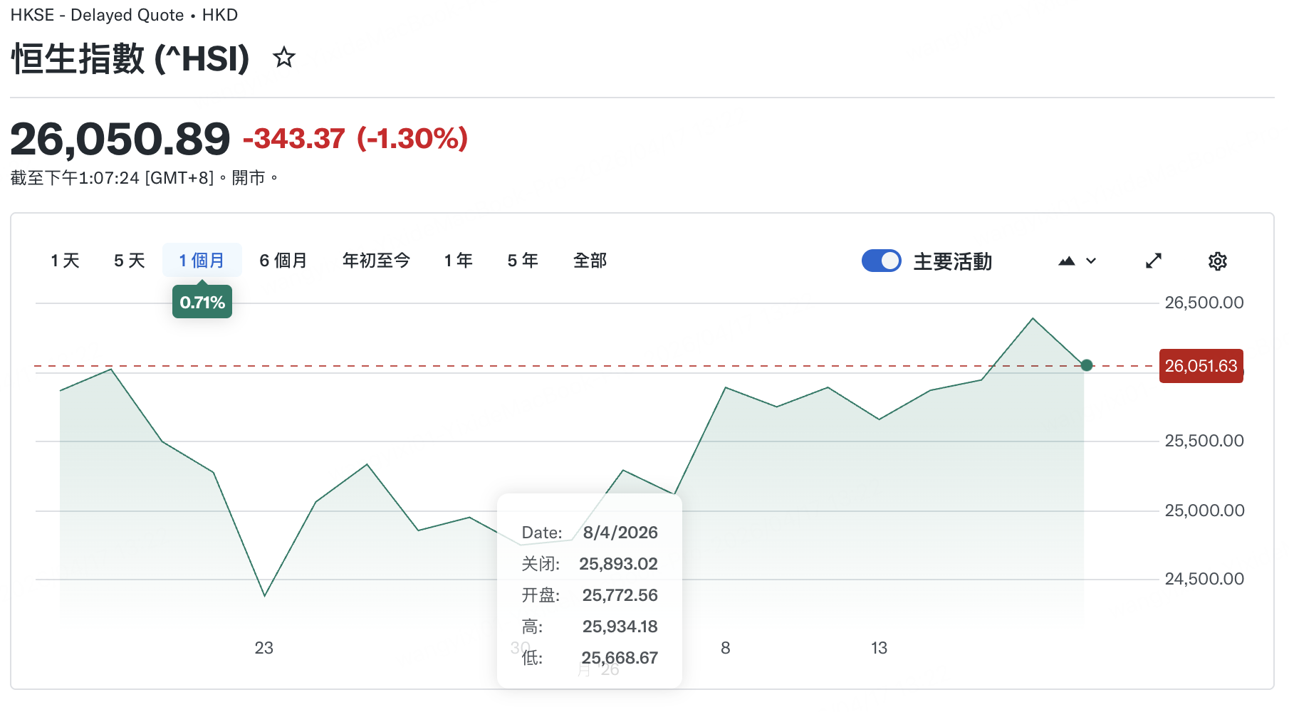 恒生指数表现更为亮眼,停火后反弹约3-5%,最新报26,374点,上涨1.65%。