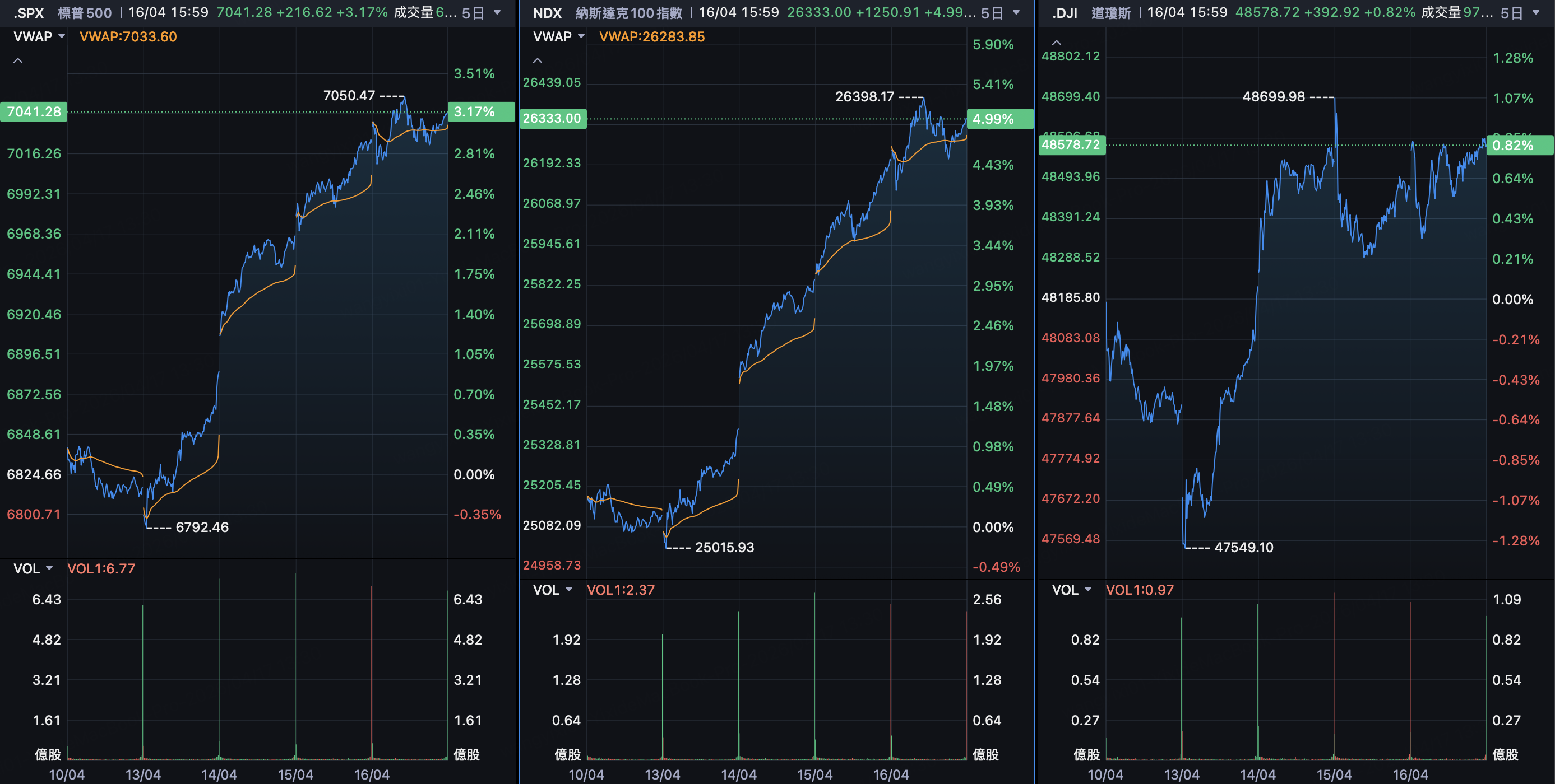 标普500指数、纳斯达克综合指数双双刷新阶段高点,道琼斯亦上涨逾1300点(创近一年最佳单日)。