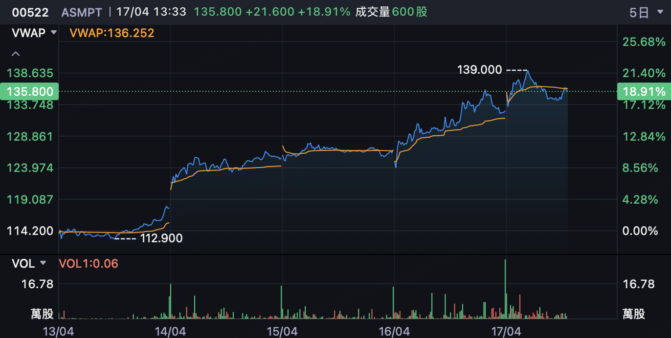 ASMPT(00522)等半导体相关股涨超5%,受益全球风险偏好回暖。