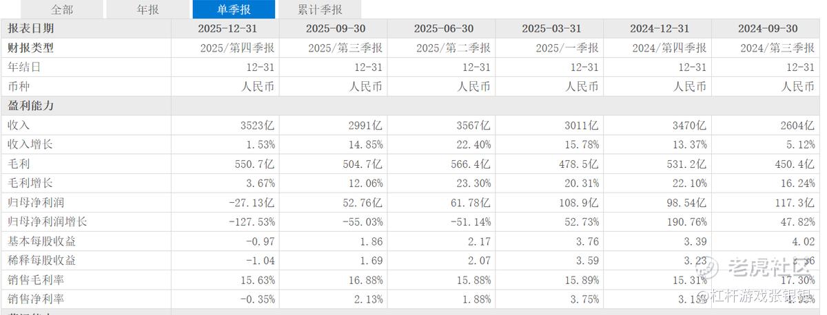 2025年第四季度,阿里经营利润同比跌74%为106.45亿元,净利润同比跌66.3%为156.31亿元;经调整EBITA同比跌57%为233.97亿元。