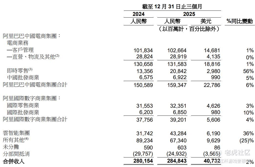 最新2025年第四季度财报显示,阿里电商集团整体收入增长6%,但核心中的核心电商业务仅增长1%,全靠即时零售(原饿了么)56%的大涨拉高平均增速。