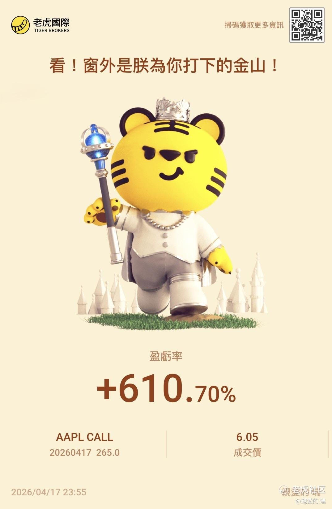 {"i18n":{"language":"zh_CN"},"data":{"magic":2,"id":554626136622632,"tweetId":"554626136622632","gmtCreate":1776441346168,"gmtModify":1776441349857,"author":{"id":3545816014358904,"idStr":"3545816014358904","authorId":3545816014358904,"authorIdStr":"3545816014358904","name":"親愛的 瑞","avatar":"https://static.tigerbbs.com/9721399c4222af5d18972a283bfe3e1a","vip":1,"userType":1,"introduction":"","boolIsFan":false,"boolIsHead":false,"crmLevel":8,"crmLevelSwitch":1,"individualDisplayBadges":[],"wearingBadges":[],"fanSize":337,"starInvestorFlag":false},"themes":[{"themeId":"5bfad02ab61749c8bfe6573ac7bbe8a3","categoryId":"b76d3c59fc044df59779c041b25852a6","name":"晒晒更赚钱","type":0,"rnLink":"https://laohu8.com/RN?name=RNTheme&page=/theme/detail&rndata={\"themeId\":5bfad02ab61749c8bfe6573ac7bbe8a3}&rnconfig={\"headerBarHidden\": true}","description":"晒晒你的盈亏单,秀秀虎友们的实力!","image":"https://static.tigerbbs.com/347184265ee0be8c363259951f8033cb"}],"images":[{"img":"https://static.tigerbbs.com/2d982a5fe75f54bbf2f8f1d24060ee31","width":"1074","height":"1644"}],"coverImages":[{"img":"https://static.tigerbbs.com/2d982a5fe75f54bbf2f8f1d24060ee31","width":"1074","height":"1644"}],"title":"","html":"<html><head></head><body><p><a href=\"https://laohu8.com/OPT/AAPL 20260417 265.0 CALL\">$AAPL 20260417 265.0 CALL$</a> 600完成<span>[得意] </span> <span>[得意] </span> </p><img src=\"https://static.tigerbbs.com/2d982a5fe75f54bbf2f8f1d24060ee31\" tg-width=\"1074\" tg-height=\"1644\"></body></html>","htmlText":"<html><head></head><body><p><a href=\"https://laohu8.com/OPT/AAPL 20260417 265.0 CALL\">$AAPL 20260417 265.0 CALL$</a> 600完成<span>[得意] </span> <span>[得意] </span> </p><img src=\"https://static.tigerbbs.com/2d982a5fe75f54bbf2f8f1d24060ee31\" tg-width=\"1074\" tg-height=\"1644\"></body></html>","text":"$AAPL 20260417 265.0 CALL$ 600完成[得意] [得意]","highlighted":1,"essential":1,"paper":1,"likeSize":3,"commentSize":0,"repostSize":0,"favoriteSize":0,"link":"https://laohu8.com/post/554626136622632","repostId":0,"isVote":1,"tweetType":1,"viewCount":479,"commentLimit":10,"likeStatus":false,"favoriteStatus":false,"reportStatus":false,"symbols":["AAPL"],"verified":2,"subType":0,"readableState":1,"langContent":"CN","currentLanguage":"CN","warmUpFlag":false,"orderFlag":false,"shareable":true,"causeOfNotShareable":"","featuresForAnalytics":["晒单贴"],"commentAndTweetFlag":false,"andRepostAutoSelectedFlag":false,"upFlag":false,"length":42,"optionInvolvedFlag":true,"xxTargetLangEnum":"ZH_CN"},"commentList":[],"hasMoreComment":false,"orderType":2}
