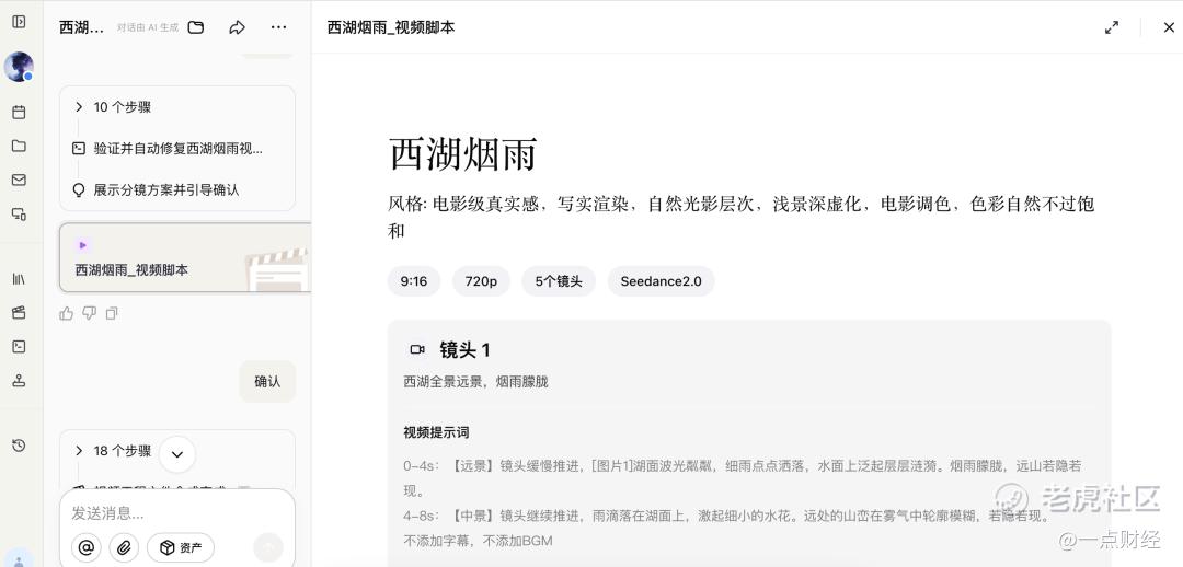 接着它生成了一个视频脚本让我确认,包括分镜、远近景等等,总体上还是挺详细的。