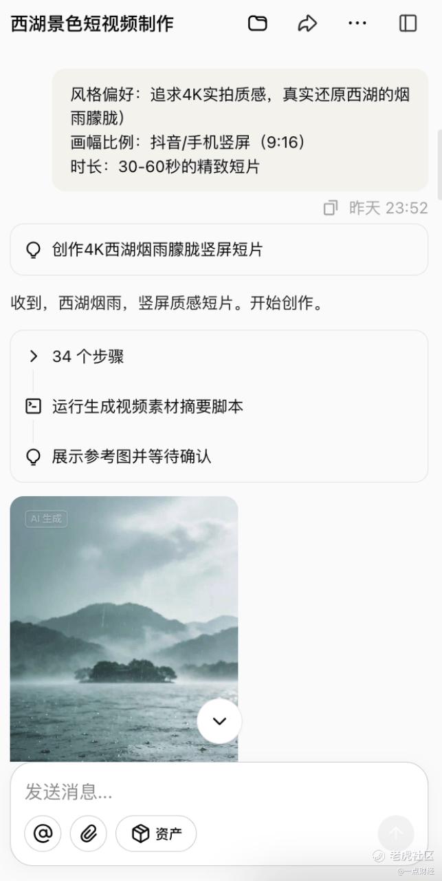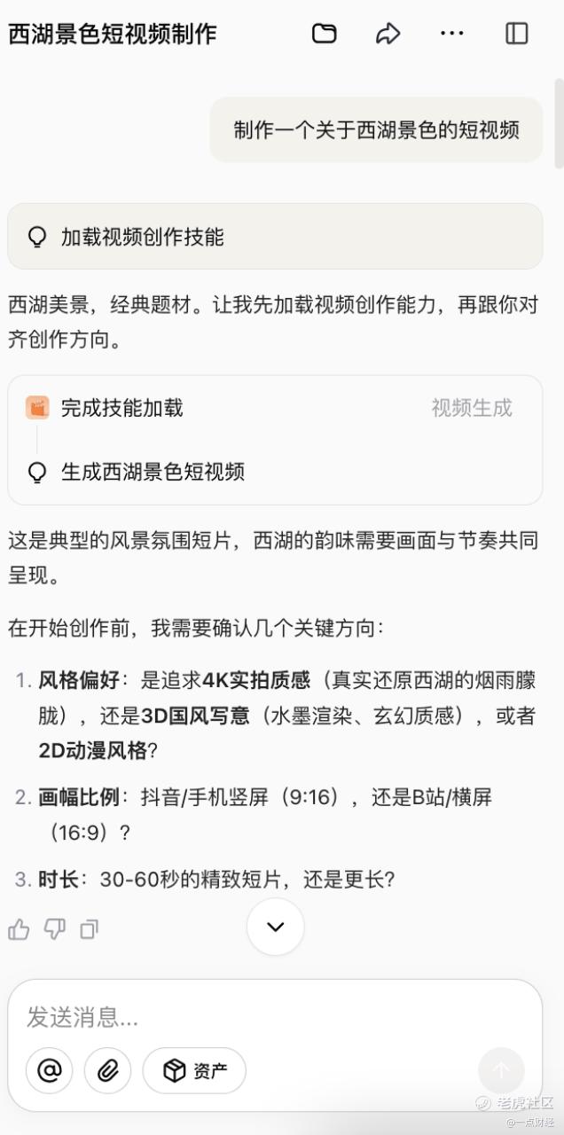 比如,我让生成一个关于西湖景色的短视频,它先跟我确认了风格偏好、画幅比例和时长。