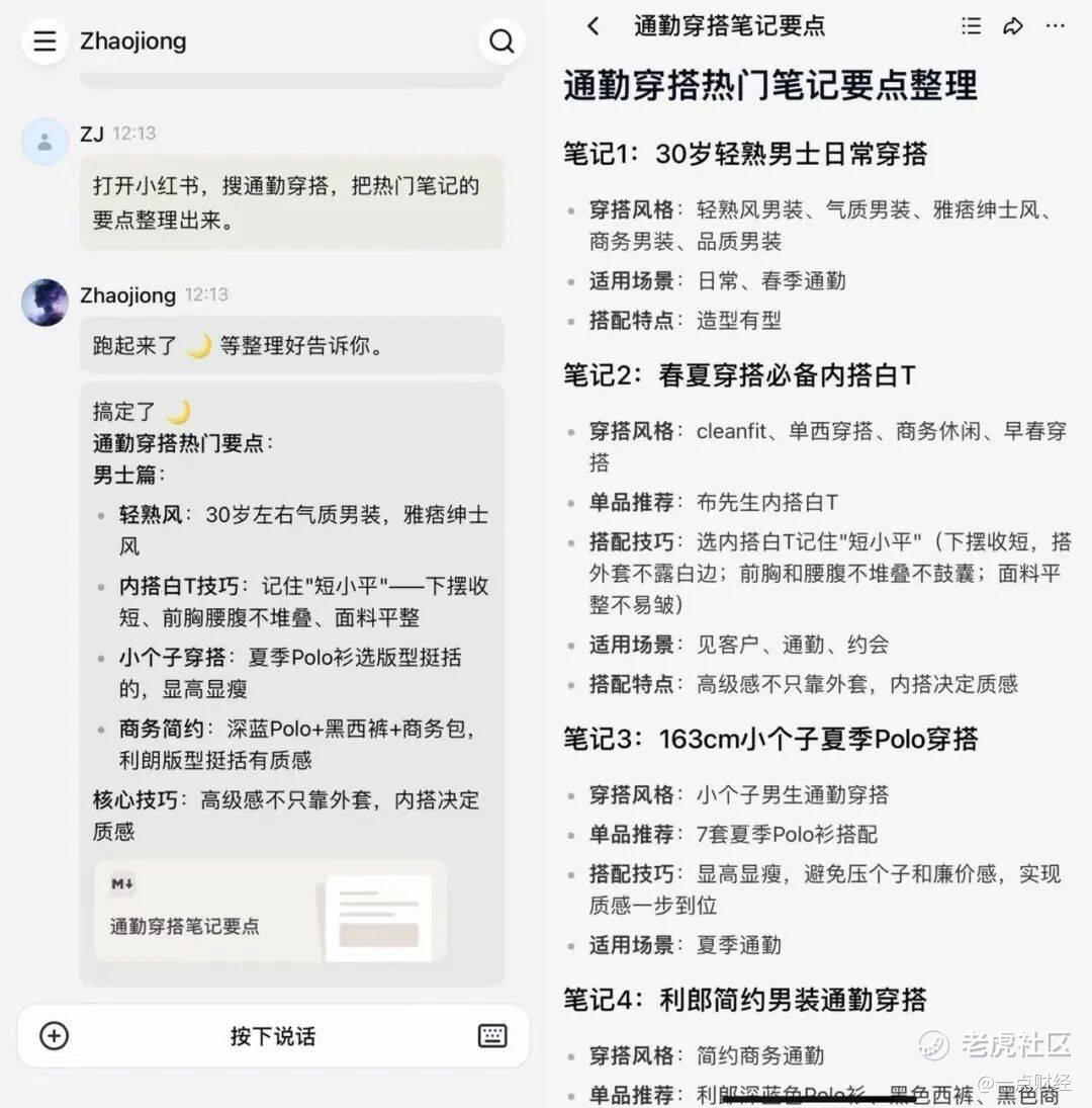 比如,我让它打开小红书,搜通勤穿搭,把热门笔记的要点整理出来。