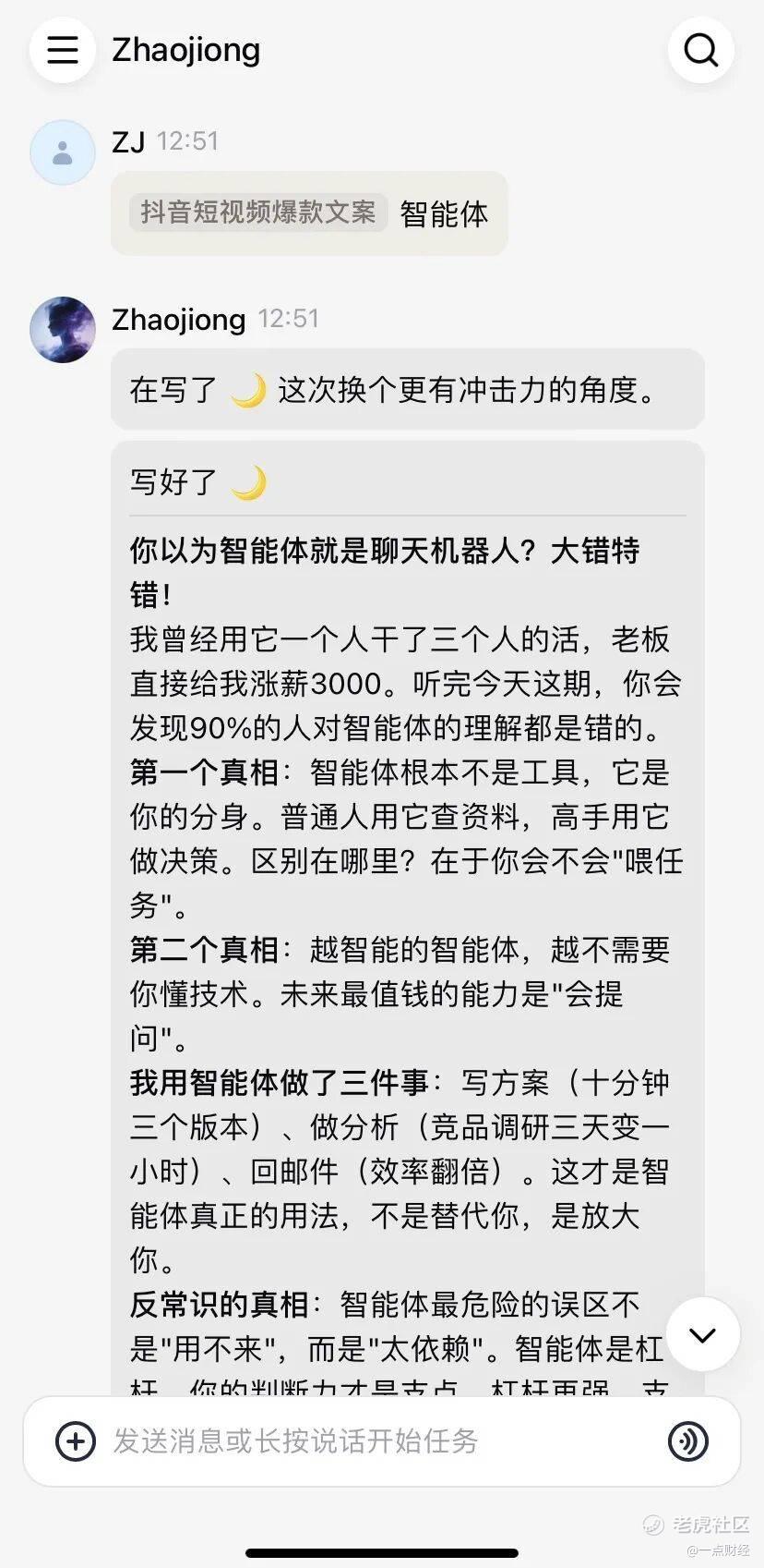 输入“智能体”之后,它就能直接围绕这个主题写出了一篇带有爆款潜质的文案。