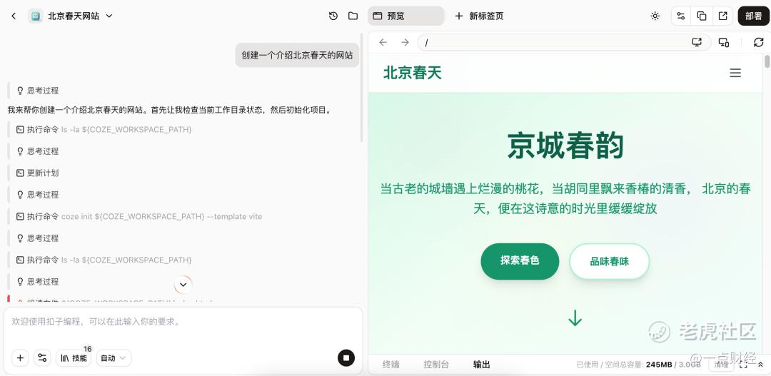 扣子编程CLI这次同步上线了。一句话描述需求,Agent就在后台自己敲代码、跑测试、部署上线。比如,我让Coze CLI创建一个介绍北京春天的网站。从项目创建到预览发布,全程不用碰代码,对于我这种完全不懂程序的人来说的确挺香。