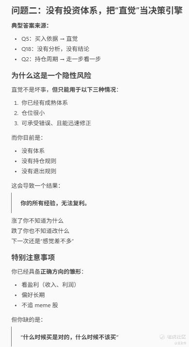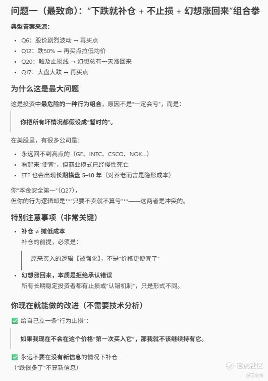 拿着我的测试答案,我跑去问AI,请根据我做的这个测试,指出我在美股投资里的最大5个问题,需要特别注意什么事项。然后得出了几个致命问题,并按“未来可能造成实质性损失”的严重程度排了序,还告诉我每个问题需要特别注意什么,以及现在就能做的最低成本改进动作。
