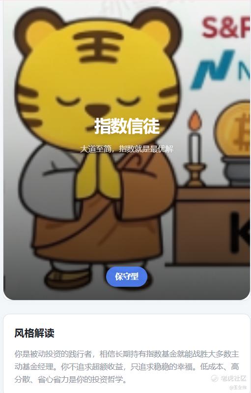 我测出来后,风格解读说 “你是被动投资的践行者,相信长期持有指数基金就能战胜大多数主动基金经理。你不追求超额收益,只追求稳稳的幸福。低成本、高分散、省心省力是你的投资哲学”。