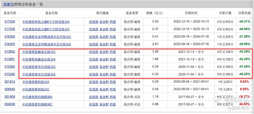 近三年全市场业绩排名靠后的10只基金中,有4只来自中信建投基金,其中中信建投智享生活A累计净值跌幅高达43.58%,中信建投低碳成长A、中信建投科技主题6个月持有A跌幅均超36%。上述产品均由基金经理周紫光管理,其在管6只基金中有4只任期回报跌超40%。