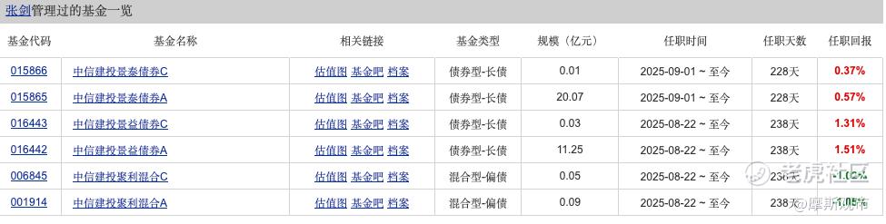 新任基金经理方面,2025年9月,新任基金经理张剑担任中信建投景泰债券型证券投资基金基金经理,目前在管基金31.51亿元,在管基金共6只,目前来说任职回报并不突出。