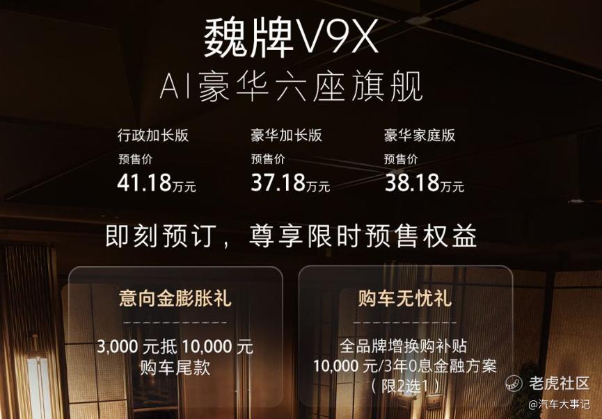 预售价37.18 万元起的魏牌V9X,作为归元 S 平台的首款旗舰车型,新车集平台全栈自研技术之大成,将硬核技术与全场景豪华体验深度融合,真正做到了 “尺寸自由选,豪华无差别”。在产品定义上,魏牌 V9X 跳出了固定尺寸的行业套路,提供三款车型选择:37.18 万元的豪华加长版、38.18 万元的豪华家庭版、41.18 万元的行政加长版,轴距 3050mm 的家庭版精准适配家用场景,轴距 3150mm 的加长版完美兼顾商务与家用需求,给了用户更灵活、更贴合自身需求的选择。