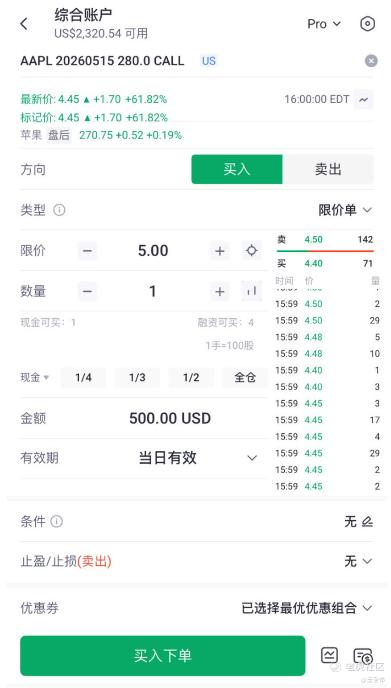 当我打开期权交易页面,我看到期权报价显示$5时,我为这一张保单实际支付的成本是:5×100=500美元。