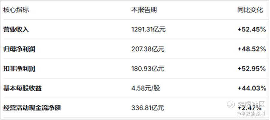 华夏能源网获悉,4月15日晚,宁德时代(SZ:300750)披露2026年第一季度业绩,营收1291.31亿元,同比增长52.45%;归母净利润207.38亿元,同比增长48.52%。