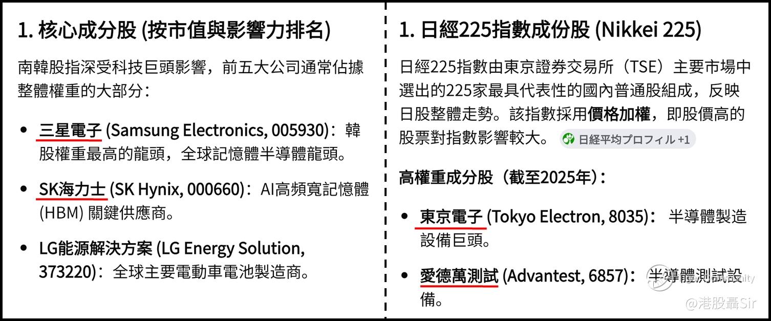 于上述亚洲股市,台湾的权重龙头是台积电、南韩的大权重股有三星电子和SK海力士,以及日本的大权重股有东京电子和Advantest,这些股份均在环球AI产业链的地位影响力大,连同美股有英伟达、博通、美光科技和AMD等,是标指或纳指成份股,意味著只要环球资金继续追捧AI产业链股份,这等股市续可看俏。