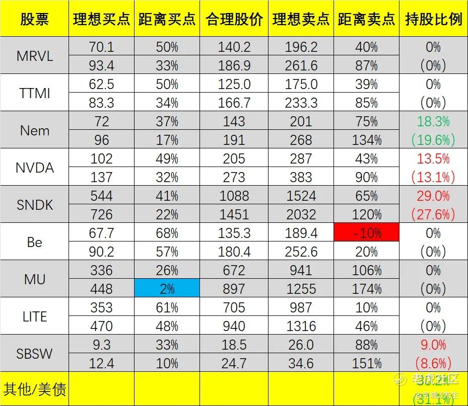 NVDA 13.5%,SNDK 29.0%,NEM 18.3%,SBSW 9.0%,现金/美债 30.2%。