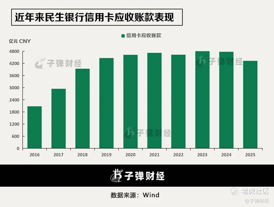 「子弹财经」注意到,民生信用卡透支在2023年为4879.73亿元,两年时间下滑超550亿元至2025年的4324.60亿元。