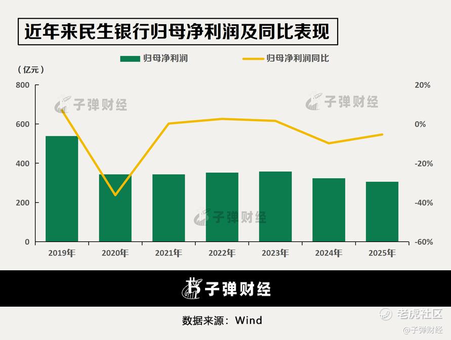 2025年,民生银行实现归母净利润305.63亿元,同比下降5.37%,连续两年负增长。