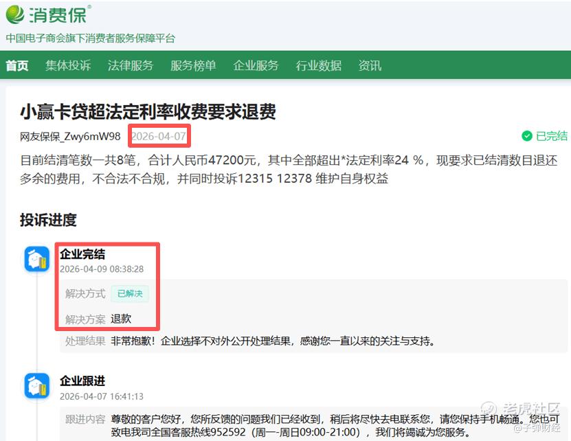 「子弹财经」查询消费保平台发现,2026年4月初,有用户称此前在小赢卡贷申请的贷款,利率超过24%监管上限,要求退还多收费用。从官方回复来看,目前已同意退款。可见,助贷机构已按照监管要求,退还此前收取的不合理费用。