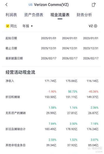 3.现金流量表是企业的“生命线”,反映了企业的资金流动路径,直接展示了经营、投资与筹资活动的真实效能。它最重要、也最难看,因为它反直觉。利润是权责发生制,现金流是收付实现制,而现金,才是企业最终的血液。一家好公司,长期看一定是用“经营活动”养活自己的。健康的企业经营活动现金流应持续为正且能够覆盖净利润。只有这样,企业才能在市场竞争中保持稳定的资金链,实现可持续发展。例如我重点关注的这只股票 $Verizon Comms(VZ)$ ,生命线就比较正常。