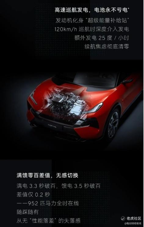 莲花For Me基于900V莲花路遥超混架构(X-Hybrid)打造,搭载2.0T混动专用发动机(46%热效率)+前后双电机,系统总功率700kW(952马力)、峰值扭矩935N・m,0-100km/h加速仅3.3秒,即便馈电(电量10%)也仅3.5秒,动力全程不衰减,日常超车、高速巡航、山路驾驶都底气十足。