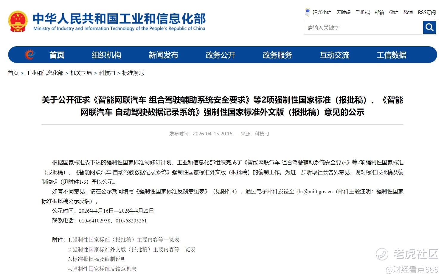 4月15日消息,工信部已组织完成《智能网联汽车 组合驾驶辅助系统安全要求》强制性国家标准(报批稿)的编制工作,目前该报批稿已正式公示,并进一步征求社会各界意见。据悉,该份国标实施日期为2027年1月1日,落地后,将规范L2辅助驾驶领域的市场竞争,对行业发展产生决定性积极影响。