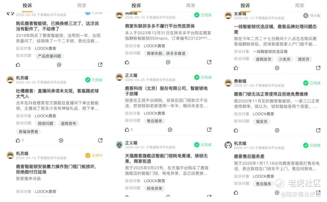 黑猫投诉平台上,关于鹿客智能锁的投诉近1000件,消费者投诉集中于电池故障、指纹识别失效、售后服务不到位、“过保就坏”等。有消费者反映安装仅三天即出现故障,售后检测后以“已过保修期”为由要求付费维修。另有消费者在保修期内遭遇售后推诿,官方售后以“非官方店铺购买”为由拒绝保修。